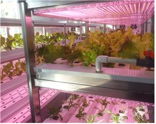 수경농원에는 발아 및 중간성장실과 물과 양액으로 채소를 재배하는 수경재배장치실이 설치돼 있다. 지난해 8월 건축공사를 시작해 12월 수경재배장치 및 향후 운영비 절감을 위해 농업용 전기수전 등 제반시설 설치를 완료했으며, 올 1월 상추와 치커리 시험재배에 성공, 2월 중순에 첫 수확의 기쁨을 맛봤다.