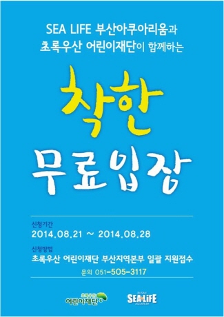 초록우산 어린이재단과 연계해 9월 한 달간 진행되는 SEA LIFE 부산아쿠아리움의 '착한 무료입장'은 오는 28일까지 일주일간 사전 신청/접수를 받는다. 기초생활 수급자 및 차상위 계층자, 편부모 가정 등의 저소득층 어린이들이 대상이며, 초록우산 어린이재단 부산지역본부(051-505-3117)를 통해 신청하면 된다.