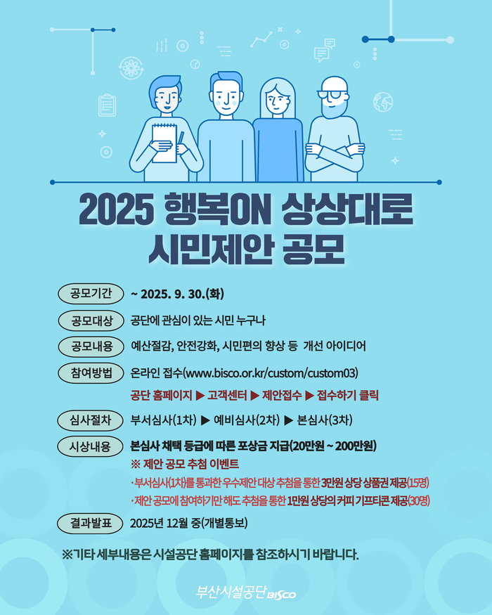 부산시설공단(이사장 이성림)은 시민이 직접 체감할 수 있는 공공서비스 혁신을 위해 오는 9월 30일까지 ‘행복ON 상상대로’ 제3기 시민 체감형 개선 아이디어 공모전을 진행한다고 밝혔다.