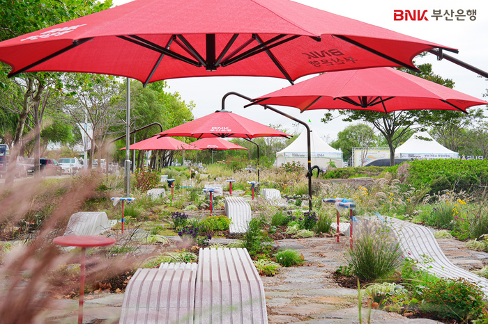 BNK부산은행이 16일 부산 삼락생태공원 낙동강 정원에 '붉은 파도가 새긴 흔적'이라는 이름의 기업 정원을 만들었다. 이 정원은 낙동강 하구의 일곱 모래톱에서 영감을 받아 파도의 곡선과 생명력을 디자인 모티브로 삼았다.
