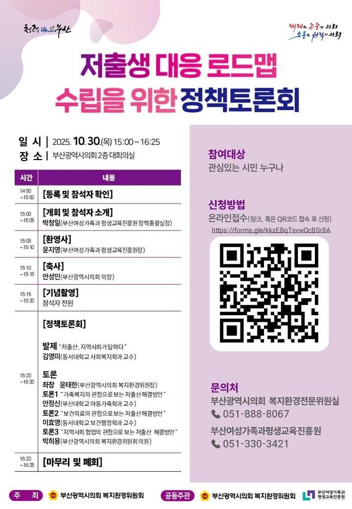 부산시의회 복지환경위원회(위원장 윤태한 의원)는 오는 30일 오후 3시 시의회 대회의실에서 '저출생 대응 로드맵 수립을 위한 정책토론회'를 연다.