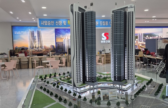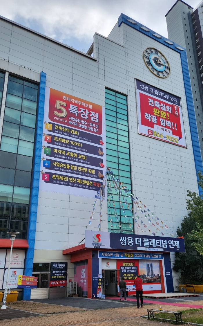부산 연제구 연산동 홈플러스 옛부지에 설치된 ‘쌍용 더 플래티넘 연제’ 분양사무소 전경.교육 환경도 안정적이다. 연서초와 연신초가 모두 도보 통학권에 위치해 안전한 등하교가 가능하며, 사직동과 동래구의 명문 학군 접근성까지 확보해 교육 수요 측면에서도 강점을 지닌다.