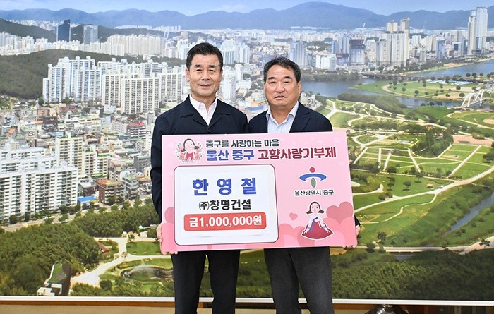 지난 9월 창명건설 한영철 대표(오른쪽)가 울산 중구청장실을 방문해 지역 발전을 위한 고향사랑 기부금 100만원 전달하고 있다.기업의 성장과 함께 지역사회와의 나눔에도 적극적이다.