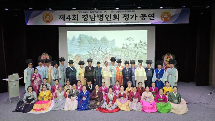 지난 6일 ‘제4회 경남시조명인회 정가공연’후 서상수 회장 등 회원들이 기념촬영을 하고 있다.대한경남시조명인회가 주최한 ‘제4회 정가공연’이 지난 6일 오후 양산 양주문화체육센터에서 열렸다.