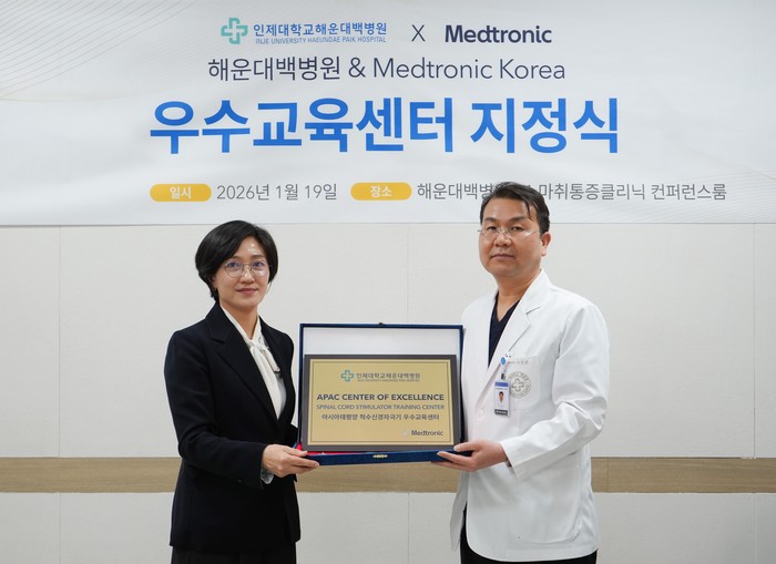 해운대백병원은 1월 19일 병원에서 김성수 원장과 이상은 마취통증의학과 교수, 메드트로닉코리아 남기숙 상무 등 관계자들이 참석한 가운데 우수교육센터 지정 기념식을 열고, 척수신경자극치료 분야의 교육 및 연구 협력 강화를 위한 운영 방향을 공유했다.