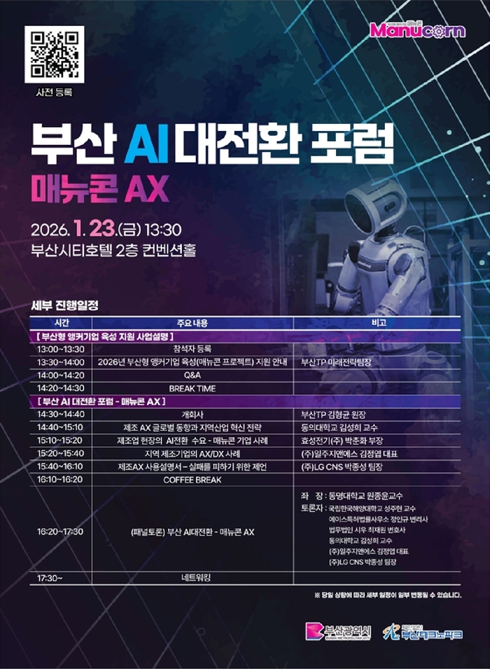 부산시(시장 박형준)는 23일 오후 1시 30분 연제구 부산시티호텔에서 (재)부산테크노파크 주관으로 「2026 부산형 앵커기업 육성 지원사업 설명회 및 부산 AI대전환 포럼 – 매뉴콘 AX」를 개최한다고 밝혔다.