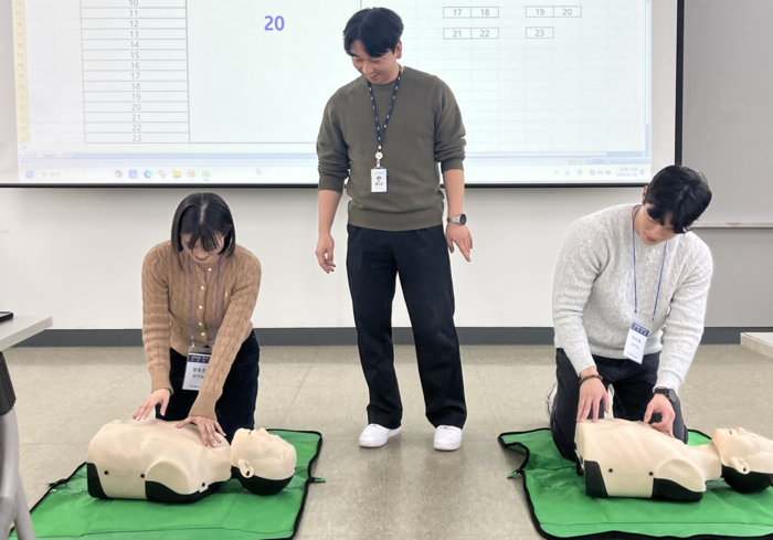 응급상황 대응 역량 강화를 위해 심폐소생술(CPR)과 자동심장충격기(AED) 사용법에 대한 실습 교육도 병행됐다. 신규직원들은 AED를 직접 조작하며 실제 상황을 가정한 반복 실습을 통해 응급처치 요령을 체득했다.