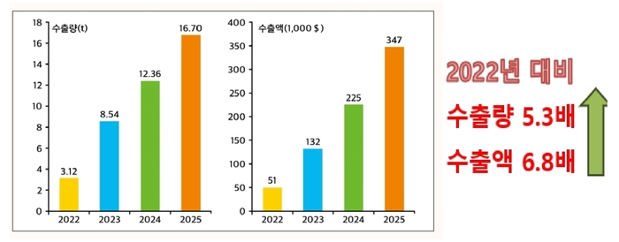하동말차의 중남미 수출 실적은 최근 몇 년 사이 경이로운 성장 기록을 쓰고 있다. 지난 2022년 3.12톤에 불과했던 수출량은 2025년 기준 16.7톤으로 약 5.3배나 늘어났다.
