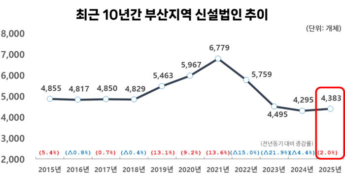 2025년 부산지역 신설법인 수는 고금리와 내수 부진 등 어려운 경기 속에서도 지난 3년간 하락세를 딛고 소폭 증가했으나, 여전히 최근 10년간 비교해 보면 낮은 수치를 기록했다. 서민경제 활성화 차원에서 창업시장 부양대책이 필요해 보인다.