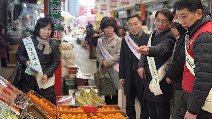 김명주 경남도 경제부지사(오른쪽 2번째)가 거제 전통시장을 둘러보고 있다.경상남도가 설 명절을 앞두고 장바구니 물가 잡기에 나섰다. 직거래장터 운영부터 온라인몰 할인, 전통시장 온누리상품권 환급까지 소비자 체감 부담을 낮추는 대책을 동시에 가동한다.