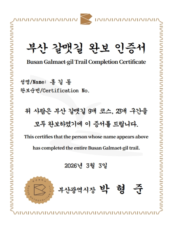 박형준 시장은 “시장 명의 인증은 형식의 변화가 아니라 완보자의 도전을 도시가 공식적으로 기록하고 예우하겠다는 선언”이라며 “걷기 여행 인프라를 지속적으로 고도화해 시민과 관광객의 만족도를 높이겠다”고 밝혔다.