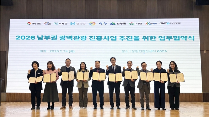 경남도는 24일 창원컨벤션센터에서 진주·의령·함안·하동·산청·함양·거창·합천 등 8개 시군, 경남관광재단과 함께 ‘남부권 광역관광개발 진흥사업’ 업무협약을 체결했다. 경상남도가 ‘하루 더 머무는 경남’을 내걸고 남부권 관광의 체질 전환에 나섰다. 개별 시군 중심의 단편적 관광에서 벗어나 권역 단위로 자원을 엮는 광역관광 전략을 본격화한다. 역사·인물 스토리텔링을 입힌 K-거상 루트와 지리산권 웰니스·워케이션 상품을 앞세워 체류형 관광지로 도약하겠다는 구상이다.