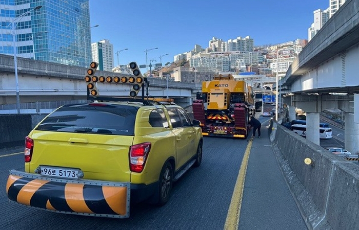 특수견인차량이 해상교량에서 고장 트레일러를 대상으로 긴급무료견인서비스를 시행중이다.부산시설공단이 해상교량에서 발생하는 대형차 고장·사고로 인한 극심한 정체를 해소하기 위해 ‘8톤 이상 대형차 긴급 견인서비스’를 도입한다. 사고 차량을 10km 이내 안전지대로 무료 이동시켜 현장 처리 시간을 줄이고 2차 사고를 예방한다는 취지다.