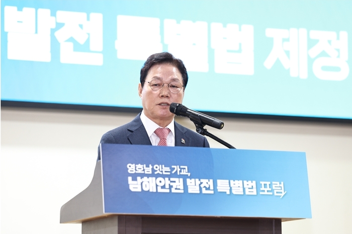 경상남도는 26일 서울 국회 의원회관에서 ‘남해안권 발전 특별법 포럼’을 열고 남해안을 국가균형발전의 새로운 성장축으로 육성하기 위한 특별법 제정을 촉구했다. 사진은 박완수 경남도지사가 환영사를 하고 있다.남해안을 대한민국의 ‘제2 경제축’으로 육성하기 위한 특별법 제정 논의가 국회에서 본격화됐다. 경남·전남·부산 3개 시도가 초광역 협력체계를 구축해 해양관광과 첨단산업을 연계한 미래 성장 전략을 추진하겠다는 구상이다. 특히 경남 남해안권의 중첩 규제 면적이 행정구역 면적을 초과한다는 점이 제시되며, 국가 차원의 제도 개선 필요성이 강하게 제기됐다.