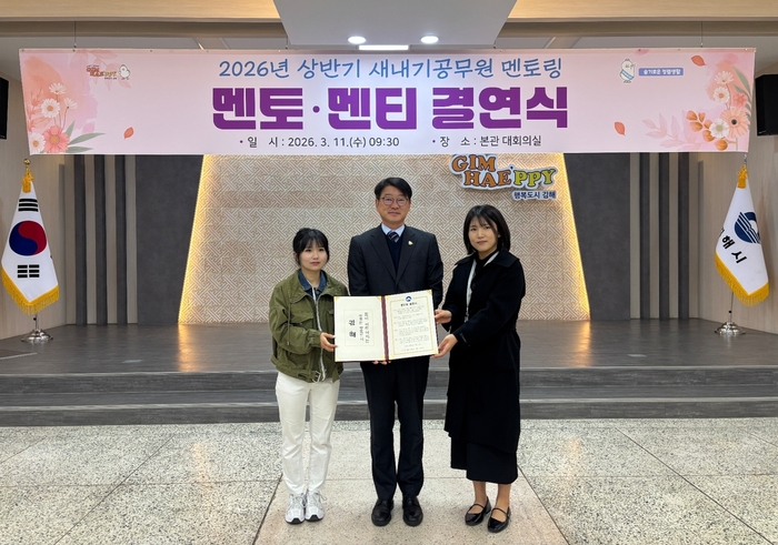 김해시는 11일 시청 대회의실에서 선배 공무원과 신규 공무원 등 52명이 참여한 가운데 ‘신규 공무원 멘토‧멘티 결연식’을 개최했다.김해시가 신규 공무원의 조직 적응을 돕고 실무 역량을 높이기 위해 선배 공무원과의 멘토링 프로그램을 운영한다. 선배와 후배 공무원이 1대1로 결연을 맺어 공직 경험과 업무 노하우를 나누며 안정적인 공직 생활 정착을 지원한다.