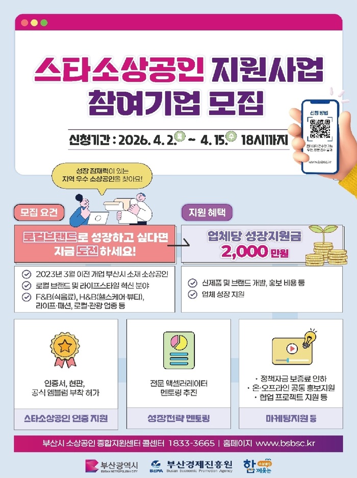 부산시는 4월 2일부터 15일까지 ‘2026년 부산시 스타소상공인 지원사업’ 참여기업을 모집한다고 밝혔다. 올해로 5년 차를 맞는 이 사업은 유망 소상공인을 발굴해 경쟁력 있는 브랜드로 성장시키고, 나아가 스타 기업으로 도약할 수 있도록 지원하는 데 목적이 있다.