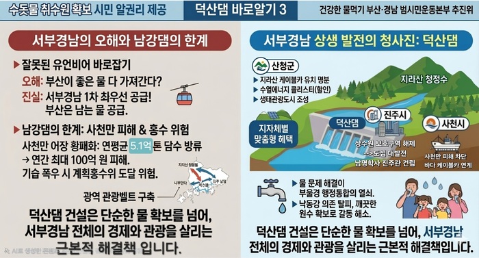 덕산댐의 물은 1차적으로 서부 경남에 최우선 공급하고, 이후 남는 물을 동부 경남에 공급하고, 마지막으로 부산에 공급하는 방식이다. 부산이 먼저 좋은 물을 가져간다는 주장은 구조적으로 성립할 수 없다. 국가수자원관리 종합정보시스템(WAMIS) 10년 평균 통계에 따르면, 사천만 방류량 연평균 5.1억톤과 여수로 방류량 연평균 4.7억톤을 합쳐 남강댐 방류량이 연평균 총 9.8억톤이다.