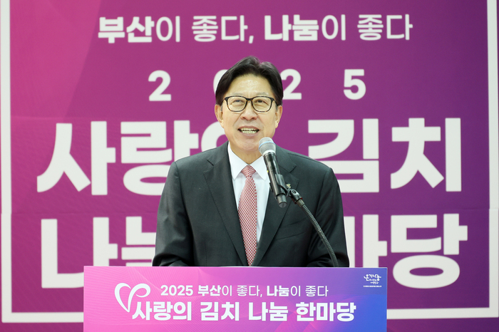 19일 오전 벡스코 제2전시장에서 열린 2025 사랑의 김치나눔 한마당에서 인사말을 하고 있다.