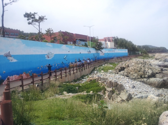 수산과학원의 앞 갈맷길 옹벽이 시원한 바다로 물들어 졌다.
