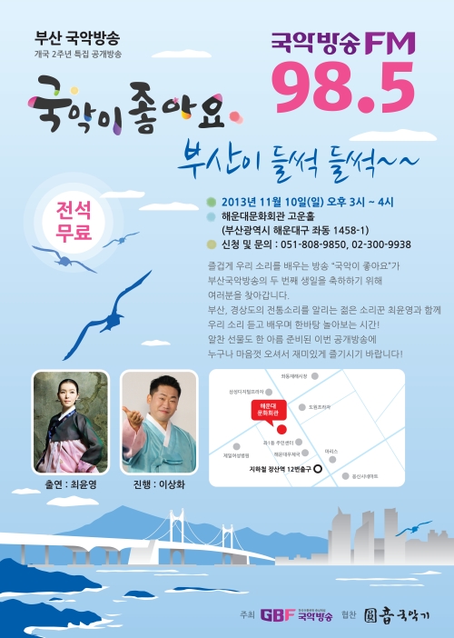국악방송(사장 채치성)이 부산 국악방송 개국 2주년 기념으로 진행하는 특집 공개방송 <국악이 좋아요! 부산이 들썩들썩!!>이 11월 10일(일) 오후 3시 부산 해운대 문화회관 고운홀에서 열린다.