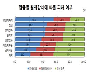 이외에도 신발섬유 38.5%, 자동차부품 36.4%, 금속가공 30.8%, 화학 22.2% 등 모든 조사업종에서 환율하락으로 피해가 발생한 것으로 나타났다.
