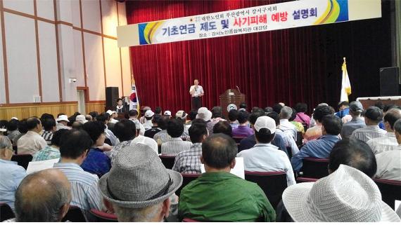 국민연금공단 북부산지사(지사장 박익수)는 17일 오는 7월 25일 첫 지급을 앞두고 있는 기초연금과 관련하여 대한노인회 강서구지회 어르신 350여분을 모시고 제도 안내와 함께 기초연금 신청 사기피해 예방을 위한 설명회를 개최했다.