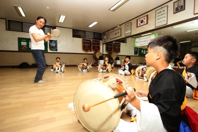 창원시 의창구 도계동의 아동복지시설인 에디슨 지역아동센터. 귓가를 울리는 가락에 이끌려 교실로 들어서니 사물놀이 수업이 한창이다. '둥둥둥…' 북편(장구의 왼편)과 채편(장구의 오른편)을 가만가만 두드리는 소리가 고요함처럼 잔잔하게 시작되더니 이내 폭풍우처럼 한껏 고조된다. 넘실거리는 굿거리장단으로 가빠진 숨을 고르고 흐트러진 매무새를 살피면서 한 판을 벌이길 10여 분. 드디어 흥겨운 가락이 끝난다.