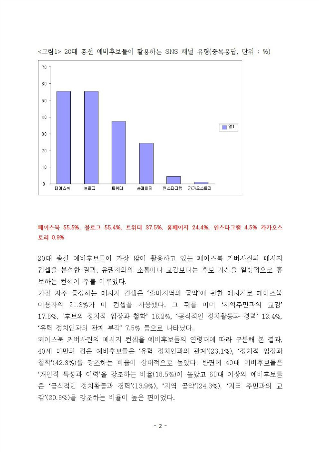 이러한 결과에 대해 최재용 소장은 “SNS는 일방적인 홍보수단이 아니다”라며 “유권자가 공감할 수 있는 콘텐츠를 SNS에 올려서 잔잔한 감동을 주는 것이 필요하다”고 밝혔다.