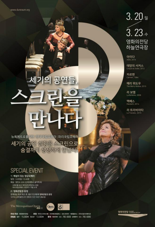 지난해 연말 ‘2016 스크린을 만나다 오프닝’을 통해 선보인 여러 작품 중에 관객들에게 많은 사랑을 받았던 오페라 6편 (‘아이다’, ‘라 트라비아타’, ‘맥베스’, ‘라보엠’, ‘메리 위도우’, ‘카르멘’)과, 대중복합 장르의 신작인 ‘태양의 서커스’까지 더해 총 7편을 특별전 기간 동안 2회 차씩 특별 상영한다.