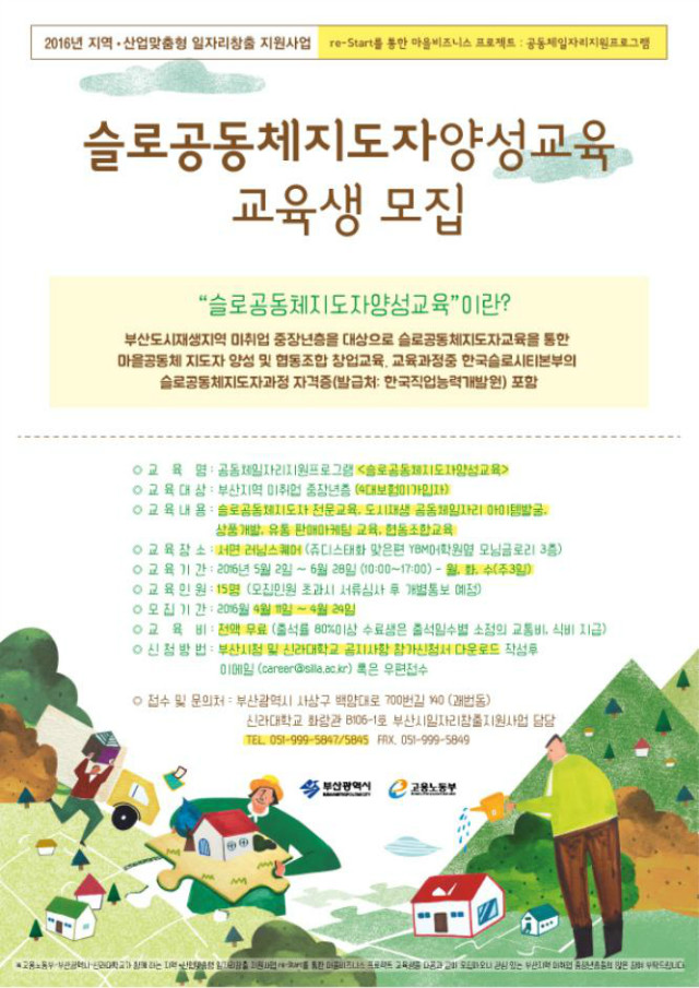 부산시는 도시재생과 연계한 서민 일자리 창출을 위한 ‘re-Start를 통한 마을 비즈니스 프로젝트’ 중 하나인 ‘슬로공동체지도자 양성교육’ 교육생을 모집한다고 밝혔다.