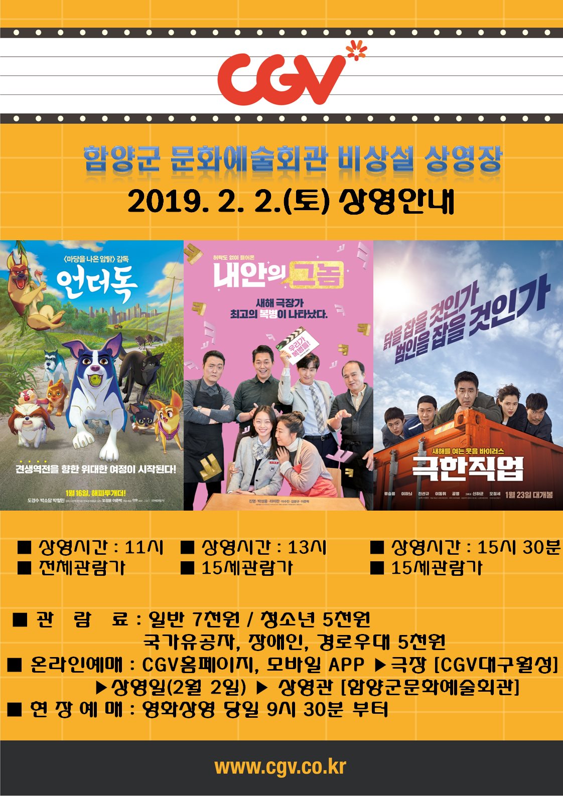 함양군 문화시설사업소는 최근 영화상영 환경의 변화 등에 따라 운영사항을 일부 변경하여 CGV 비상설 상영장을 지속운영 및 군민들에게 보다 많은 영화 관람의 기회를 제공할 수 있게 되었다고 밝혔다.