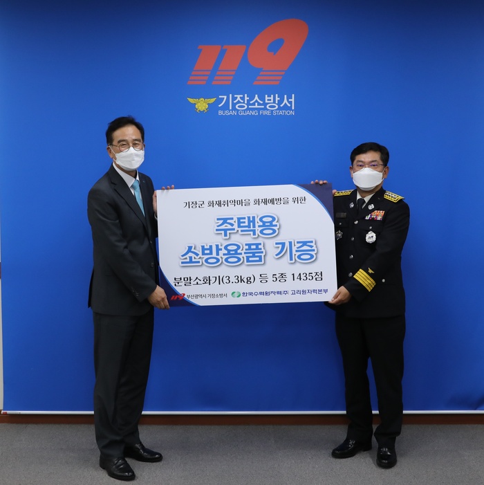 부산 기장소방서와 한국수력원자력 고리원자력본부가 15일 오후 기장소방서에서 ‘주택용 소방시설 보급 및 보이는 소화기함 설치’ 사업을 위한 주택용 소방용품 기증식을 진행했다.
