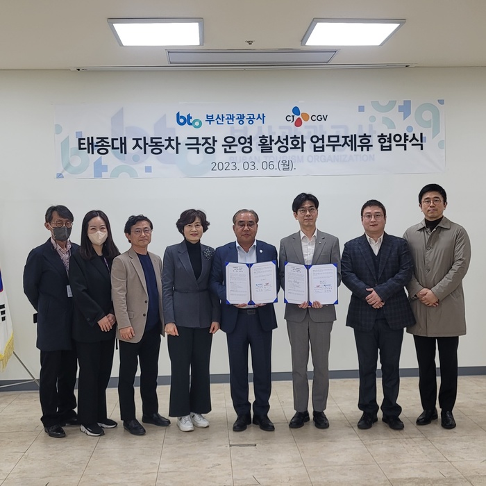 부산관광공사(이하‘공사’)는 CJ CGV(주)(대표 허민회)와 6일 태종대 자동차 야외 극장의 안정적인 운영과 활성화를 위한 업무제휴 협약을 체결했다.