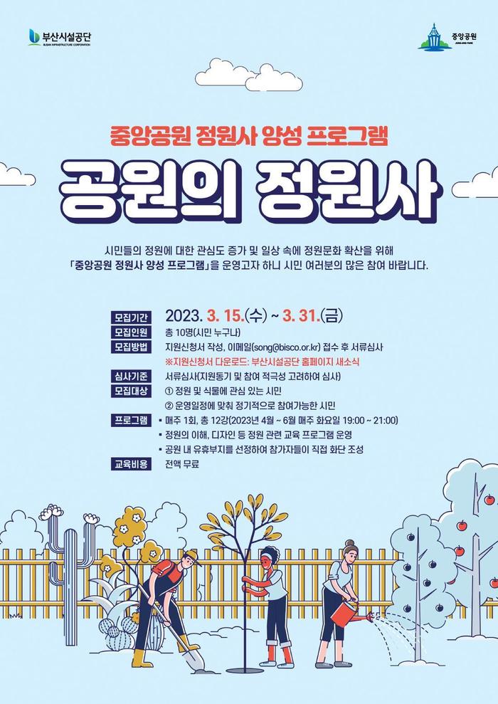 부산시설공단(이사장 직무대행 박인호)은 중앙공원 정원사 양성 프로그램 교육생을 오는 31일까지 공개 모집한다고 밝혔다.