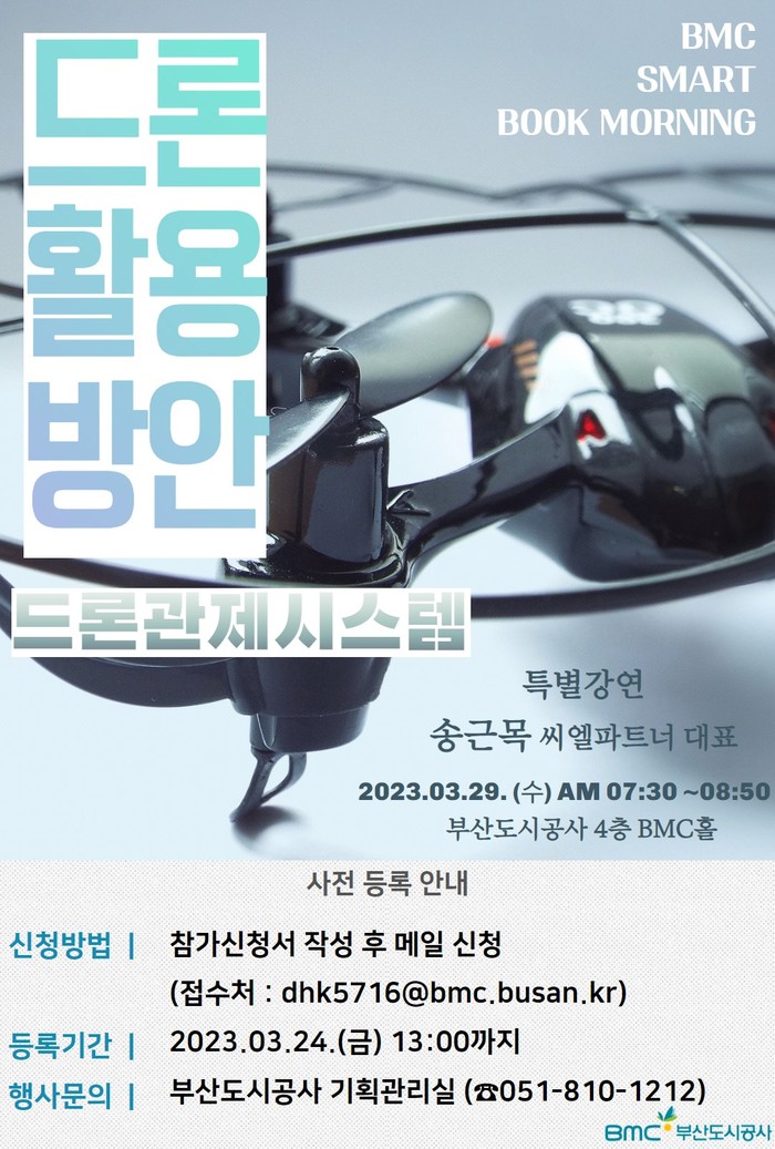 이번‘제8회 스마트 BOOK모닝’행사는 건설 분야의 드론활용 방안 및 드론관제시스템을 주제로 씨엘파트너 송근목 대표의 강연과 자유 토의 및 질의응답 등이 진행된다.