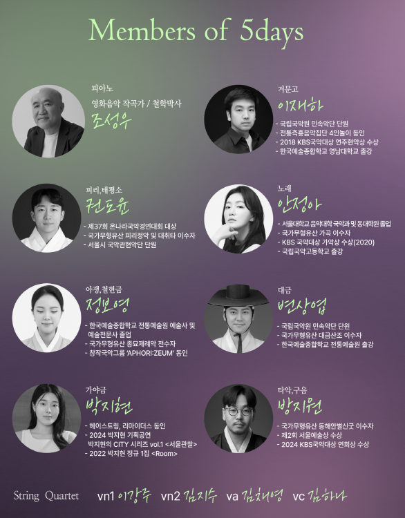이번 무대는 국악계를 대표하는 정상급 연주자들이 대거 참여해 높은 기대를 모은다. 거문고 이재하, 대금 변상엽, 타악·구음 방지원, 노래 안정아, 피리·태평소 권도윤, 가야금 박지현, 아쟁·칠현금 정보영 등 한국음악을 이끄는 연주자들이 한자리에 모여 깊이 있는 사운드를 들려줄 예정이다. 여기에 영화음악가 조성우의 감성적인 피아노와 현악 4중주가 더해져 <5-Days>는 전통과 현대가 공존하는 새로운 한국음악의 가능성을 제시한다.