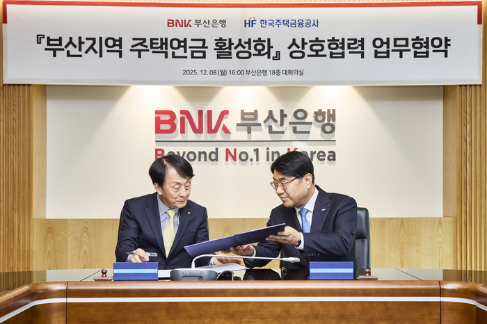 BNK부산은행(은행장 방성빈)은 8일 오후, 본점 대회의실에서 한국주택금융공사와 ‘부산지역 주택연금 활성화’ 상호협력 업무협약을 체결했다.(사진 오른쪽부터 BNK부산은행 방성빈 은행장, 한국주택금융공사 김경환 사장)BNK부산은행(은행장 방성빈)은 8일 오후, 본점 대회의실에서 한국주택금융공사와 ‘부산지역 주택연금 활성화’ 상호협력 업무협약을 체결했다고 9일 밝혔다.