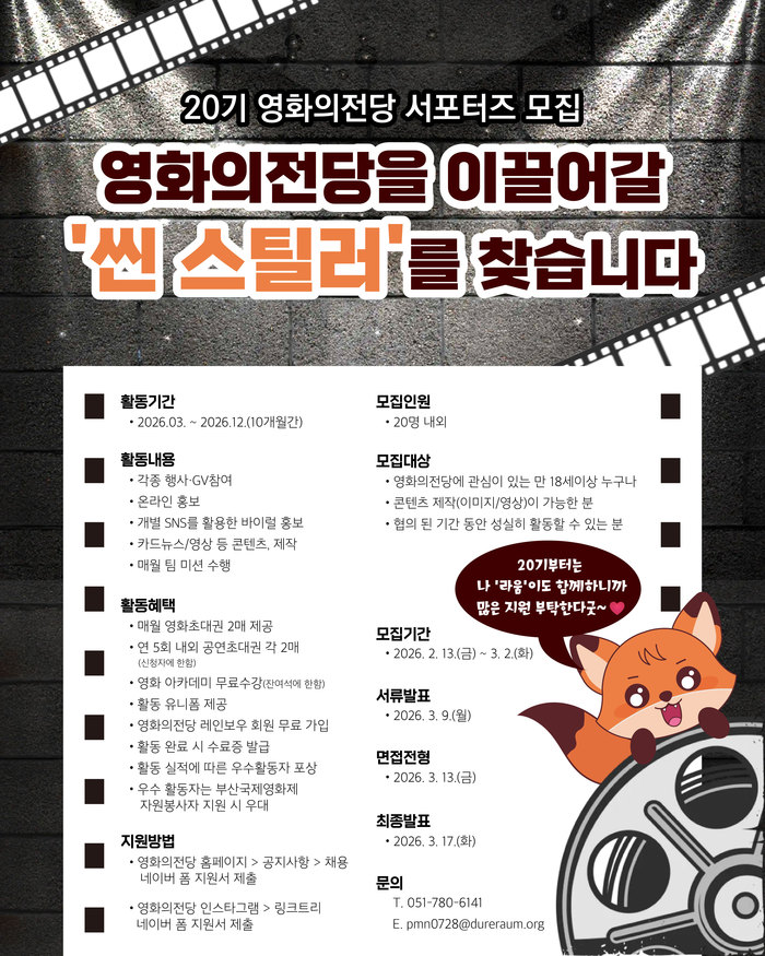 영화도시 부산을 대표하는 문화공간 영화의전당이 홍보 활동에 직접 참여할 제20기 서포터즈를 모집한다. SNS 콘텐츠 제작부터 주요 행사 현장 참여까지 다양한 실무 경험을 쌓을 수 있는 시민 참여형 프로그램이다.