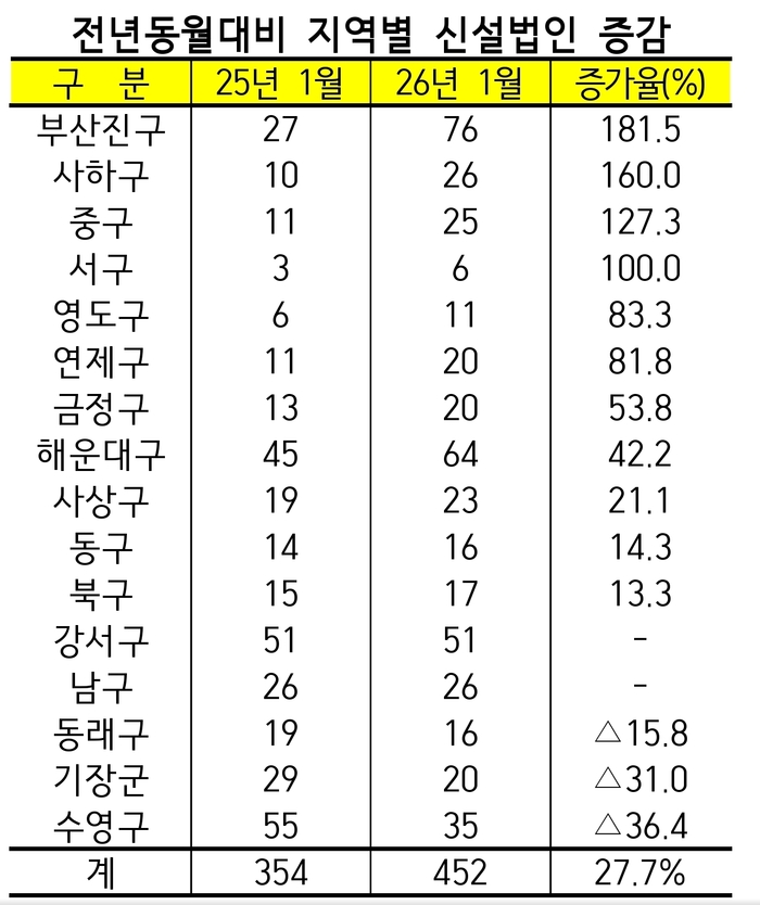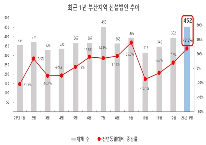 조사에 따르면 올해 1월 부산지역 신설법인은 452개체로 집계됐다. 이는 전년 같은 달보다 27.7%, 전월 대비 15.3% 증가한 수치로, 지난해 11월 이후 3개월 연속 증가세다.