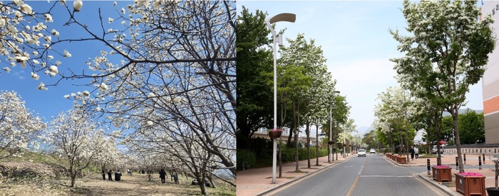 김해시민의 숲(목련) ▲가야의 거리(이팝나무)서김해IC 인근 금관대로와 주촌신도시, 봉황역에서 국립김해박물관으로 이어지는 ‘가야의 거리’, 반룡산공원 등에서도 이팝나무 가로수와 군락을 볼 수 있다.