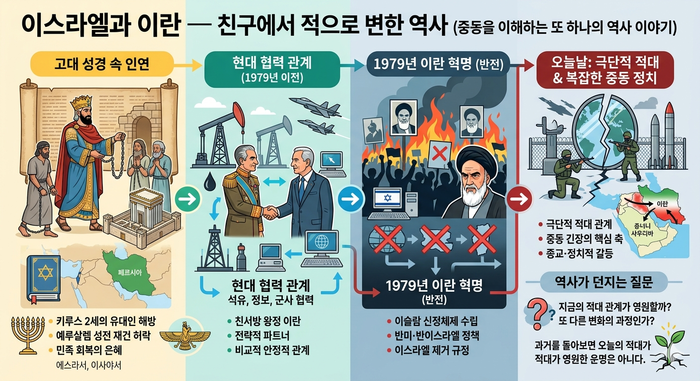 오늘날 이란과 이스라엘은 서로를 향해 가장 강한 적대감을 드러내는 국가가 되었다. 그러나 역사를 돌아보면 두 나라의 관계는 단순한 적대의 역사만으로 설명되지 않는다. 성경의 기록 속에서 페르시아는 이스라엘을 포로 생활에서 해방시킨 나라였고, 현대 역사에서도 한때 협력 관계를 유지한 시기가 있었다. 역사는 때때로 이렇게 묻는다. 지금의 적대 관계가 영원한 것일까, 아니면 또 다른 변화의 한 과정일 뿐일까. 중동의 미래는 여전히 불확실하다. 그러나 과거의 역사를 돌아보면 한 가지 사실만은 분명하다. 오늘의 적대가 반드시 영원한 운명은 아니라는 점이다.