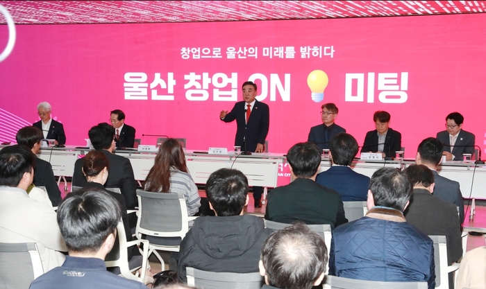 김두겸 울산시장은 16일 종하이노베이션센터 4층 운당홀에서 청년 창업가 100여 명과 창업지원사업을 공유하고 현장의 건의사항을 듣는 '울산 창업 온(ON) 미팅’을 진행했다.울산광역시가 청년 창업가들과 직접 만나 창업 현장의 목소리를 듣고 창업 생태계 활성화 방안을 논의하는 자리를 마련했다. 울산시는 16일 종하이노베이션센터에서 ‘울산 창업 온(ON) 미팅’을 열고 지역 스타트업과 창업 지원 정책 방향을 공유했다.
