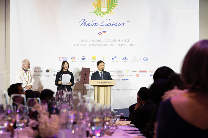 지난 15일부터 16일까지 서울 풀만 앰배서더 서울에서 프랑스명장요리사협회 세계총회가 개최됐다. 단상에는 김성범 해양수산부 장관 직무대행.특히 행사 기간 동안 프랑스 명장 셰프 5명이 참여하는 식자재 경연대회가 열려 출품 제품의 맛과 활용도를 평가한다. 이 대회에서 1~3위를 차지한 업체는 프랑스 명장 요리사 회원들이 운영하는 해외 호텔과 레스토랑, 백화점 등에 제품을 입점할 수 있는 기회를 얻게 된다.