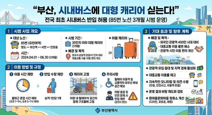 부산시가 전국 최초로 시내버스 내 대형 캐리어 반입을 허용하는 시범사업을 추진한다. 외국인 관광객 400만 시대를 대비한 교통 혁신 조치로, 관광객과 시민 모두의 이동 편의 개선 효과가 기대된다.