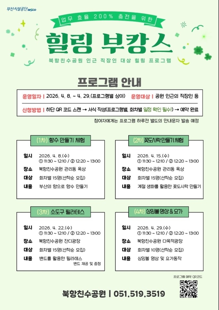 프로그램은 감성과 건강을 동시에 챙길 수 있도록 다양하게 구성됐다. ▲부산의 향을 담아 나만의 향을 제작하는 향수 만들기 ▲계절 생화를 활용한 꽃도시락 만들기 ▲밴드를 활용해 몸의 긴장을 풀어주는 소도구 필라테스 ▲심신 안정을 돕는 싱잉볼 명상과 요가 프로그램 등이 운영된다.