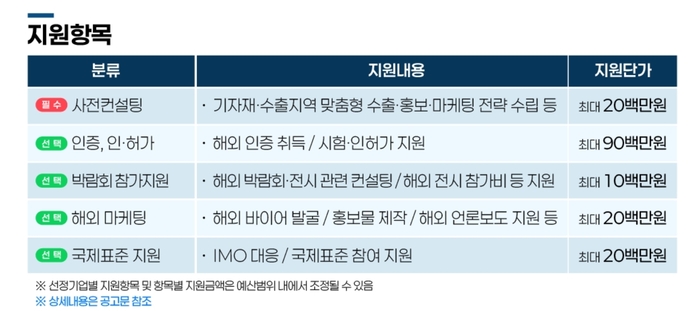 지원 내용은 단순 자금 지원을 넘어 실질적인 수출 역량 강화에 초점이 맞춰져 있다. 사전 컨설팅을 시작으로 해외 인증 및 인·허가 취득, 해외 박람회 참가, 글로벌 마케팅까지 전 과정을 패키지로 지원한다.