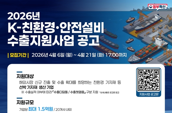 해양수산부는 국내 선박기자재 기업의 해외시장 경쟁력 강화를 위해 ‘K-친환경·안전설비 수출 지원사업’ 참여기업을 4월 6일부터 21일까지 모집한다고 밝혔다.