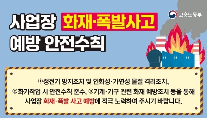 이번 조치는 지난 3월 20일 대전 대덕구에서 발생한 화재사고로 14명이 숨지는 등 최근 잇따른 산업현장 화재 참사를 계기로 마련됐다. 고용노동청은 소방청과 지방자치단체와 협업해 위험요인을 사전에 제거하는 데 초점을 맞추고 있다.