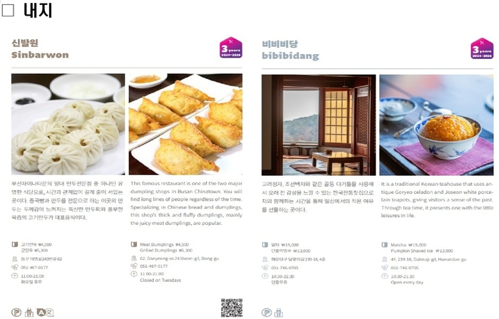 가이드북은 부산관광포털 누리집(visitbusan.net)의 ‘여행준비-가이드북&지도’ 메뉴를 통해 온라인으로 열람하거나 내려받을 수 있으며, 선정 식당과 관광안내소, 영사관 등 주요 거점에도 비치된다. 이와 함께 휴대용 ‘포토카드’도 제작돼 관광객에게 무료로 제공될 예정이다.