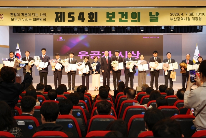 부산시는 7일 오전 시청 대강당에서 「제54회 보건의 날 기념식」을 개최했다. 사진은 유공자 시상 장면.부산시가 세계 보건의 날을 맞아 ‘건강도시 부산’ 구축 의지를 공식화했다. 보건의료인들의 헌신을 조명하는 한편, 고령화와 감염병 등 변화하는 보건환경에 대응하기 위한 공공의료 강화 방침을 강조했다.
